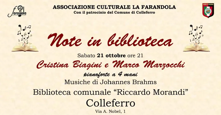 Colleferro. Torna “La Farandola” con “Note in Biblioteca”. Sabato 21 Ottobre, ore 21, Brahms al pianoforte a quattro mani: Cristina Biagini e Marco Marzocchi