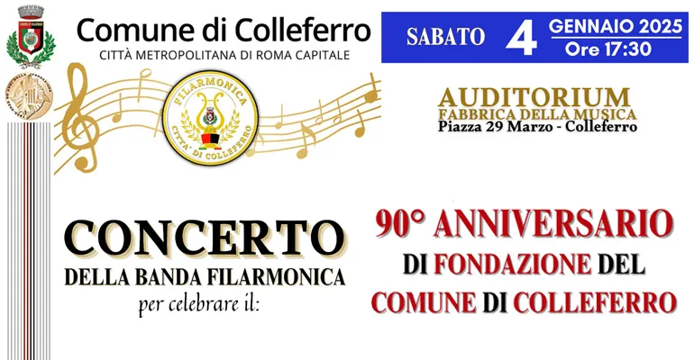 COLLEFERRO SCALO – In occasione del 90° Anniversario della fondazione del Comune di Colleferro, la Filarmonica Città di Colleferro, terrà