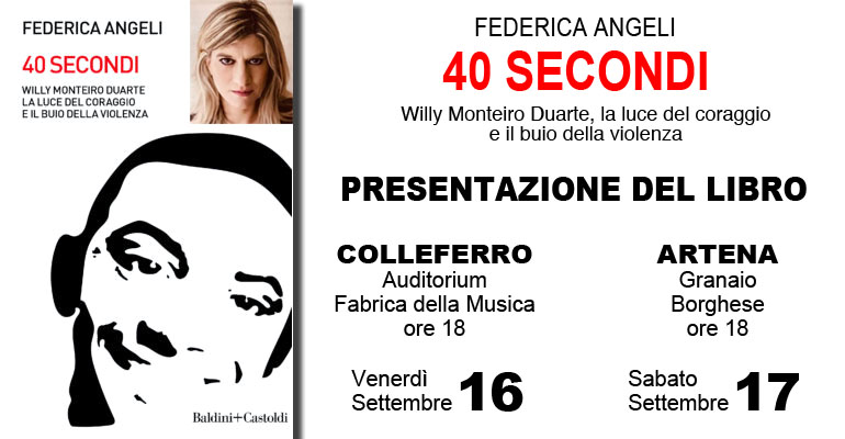 Venerdì 16 a Colleferro e Sabato 17 ad Artena in presentazione il libro di Federica Angeli “40 Secondi – Willy Monteiro Duarte, la luce del coraggio e il buio della violenza”