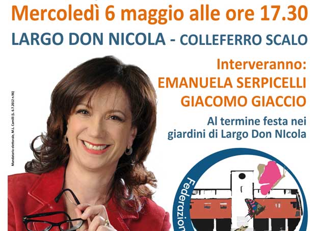 Leggi tuttoCOLLEFERRO (RM) – Mercoledì 6 Maggio 2015 ore 17.30. Largo Don Nicola, Colleferro Scalo. Apertura della campagna elettorale della candidata
