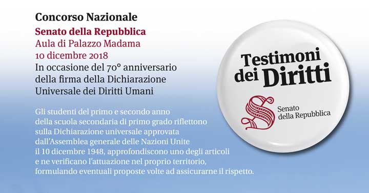 Lunedì 10 Dicembre 2018 in Senato premiazione dell’I.C. Duilio Cambellotti di Rocca Priora per il progetto vincitore del concorso “Testimoni dei diritti”