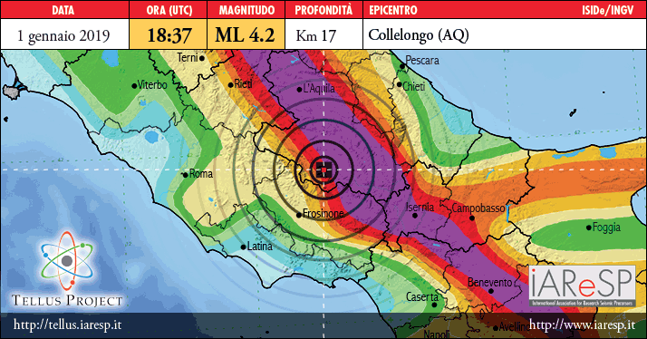 Il sisma si è verificato secondo le seguenti coordinate orarie: 01-01-2019 18:37:46 (UTC) | 01-01-2019 18:37:46 (UTC +01:00) ora italiana