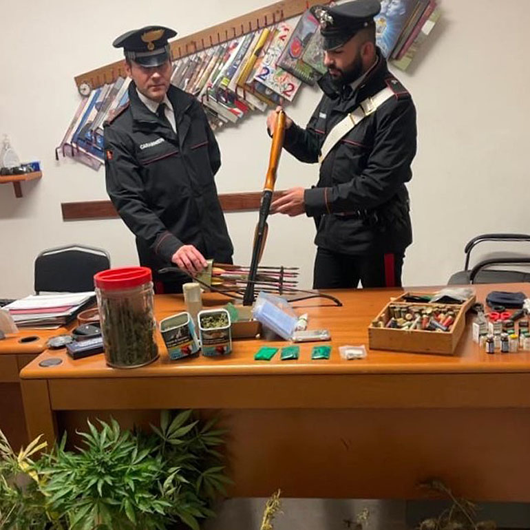 La perquisizione ha permesso di rinvenire e sequestrare 14 piante di marijuana in essicazione, e dosi della stessa sostanza già confezionate e pronta per lo smercio, quasi 100 cartucce per fucili e diversi flaconi di anabolizzanti vietati dalla legge e, soprattutto, pericolosi per chi dovesse assumerli.