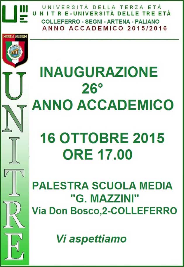 COLLEFERRO (RM) – Si inaugurerà il prossimo 16 Ottobre alle ore 17 – presso la Palestra della Scuola Media G. Mazzini – Istituto Comprensivo Don Bosco, in Via Don Bosco, 2 a Colleferro – il 26° Anno Accademico dell’Unitre – Università delle Tre Età di Colleferro – Segni – Artena e Paliano.