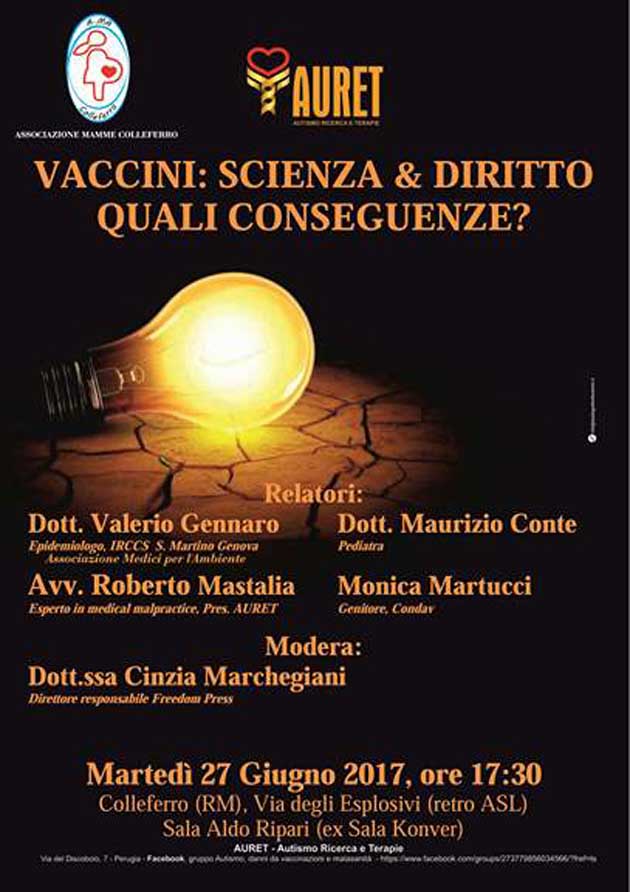 «L’Associazione Mamme Colleferro, in collaborazione con Auret (Autismo Ricerche e Terapie), invita la cittadinanza alla conferenza “Vaccini: Scienza E Diritto. Quali Conseguenze?” che si terrà il giorno 27 Giugno alle h.17.30 nella sala Aldo Ripari in via degli Esplosivi (click sull’immagine in basso per ingrandire •>).