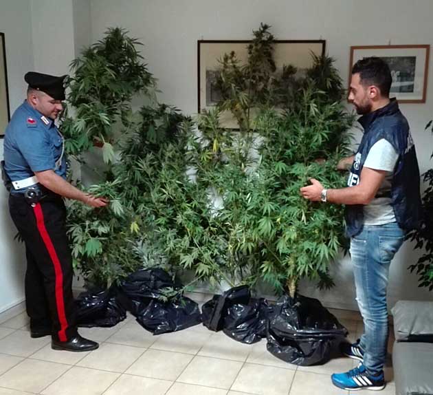 VALMONTONE | ARTENA (RM) – I Carabinieri della Compagnia di Colleferro hanno arrestato un italiano, di 56 anni, e il figlio, di 24 anni, trovati in possesso di 5 piante di canapa indiana, alte quasi due metri, all’interno del loro giardino.