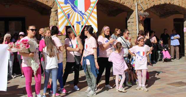 Partenza da Piazza Umberto Pilozzi, dove il Parroco Don Marco Fiore ha benedetto i partecipanti, e a fare da battistrada l’ormai storica “apetta” tutta rigorosamente rosa, poi le Blue Stars Majorettes, Banda Musicale “Prof. Otello Francesconi”, le donne del Girasole, le tante associazioni che hanno aderito con grande entusiasmo all’evento e tantissimi cittadini. Un lungo e coloratissimo corteo che ha attraversato le vie della città camminando insieme per fare strada alla prevenzione, scandendo lo slogan “Facciamo prevenzione: una diagnosi precoce può salvarci la vita”, rivolto a tutte le donne.