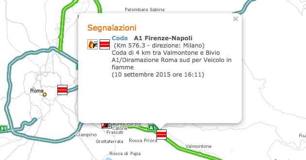 La segnalazione è giunta a partire dalle ore 15:20 ed il tratto di autostrada interessato è quello compreso tra Valmontone e la diramazione Roma-Sud in direzione nord, esattamente al Km. 576,3.