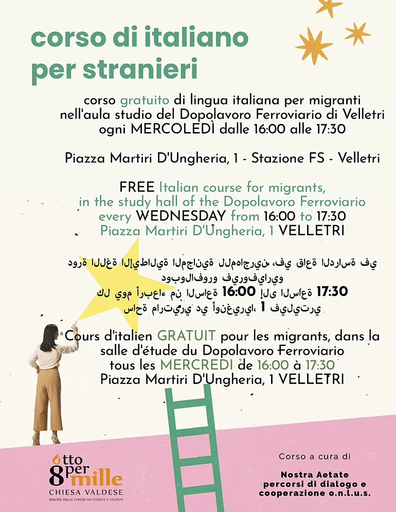 Grazie all’impegno di “Nostra Aetate” percorsi di dialogo e cooperazione o.n.l.u.s., è stato avviato un corso gratuito di lingua italiana rivolto a tutti coloro che desiderano migliorare la propria conoscenza della lingua e facilitare così l’integrazione nel tessuto sociale e lavorativo del territorio.