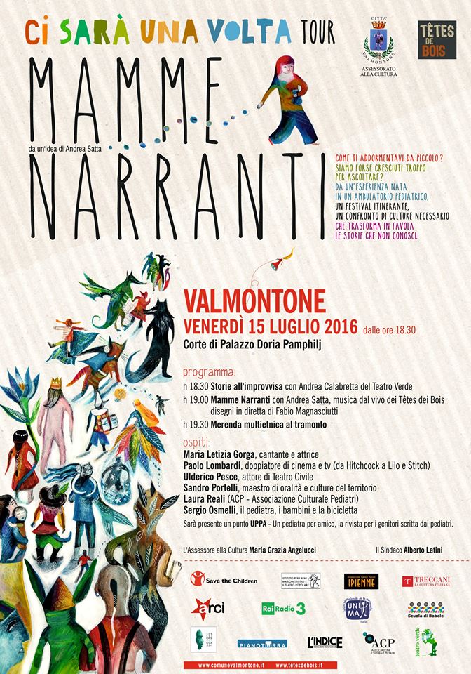 “Ci sarà una volta tour – Mamme narranti” è un progetto straordinario ideato dal pediatra Andrea Satta, voce e anima dei Tetes de Bois, che nasce dall’idea di raccogliere le storie che raccontano le mamme per addormentare i loro bambini, quelle che vengono tramandate di bocca in bocca, di orecchio in orecchio, di cuore in cuore. “Mamme narranti – Ci sarà una volta tour” è anche un Festival e un momento di incontro e inclusione che mette al centro le favole. Sullo stesso palco artisti e mamme, medici, scienziati e intellettuali, per sottolineare e recuperare il valore del racconto e della voce materna e, proprio a partire da questo, per coltivare l’idea di un mondo più accogliente. A sostegno e complemento dell’esperienza, Andrea Satta ha già pubblicato due libri di cui l’ultimo Mamma, quante storie!, edito da Treccani, con le illustrazioni di Sergio Staino e Fabio Magnasciutti, è stato recentemente presentato al Salone del Libro di Torino.