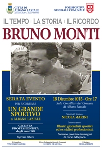ALBANO LAZIALE (RM) – Venerdì 18 Dicembre 2015, alle ore 17, nella Sala Consiliare del Comune di Albano Laziale, si terrà una “Serata evento” per ricordare il grande sportivo, ciclista professionista degli anni ’50, Bruno Monti, nativo del centro castellano.