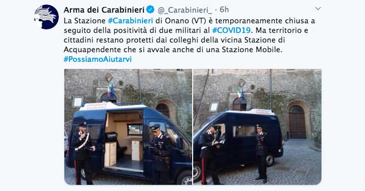 VITERBO | ONANO – Due dei tre nuovi positivi registrati in Provincia di Viterbo sono militari della Stazione Carabinieri di Onano, paesino di un migliaio di abitanti al confine con la Toscana.
